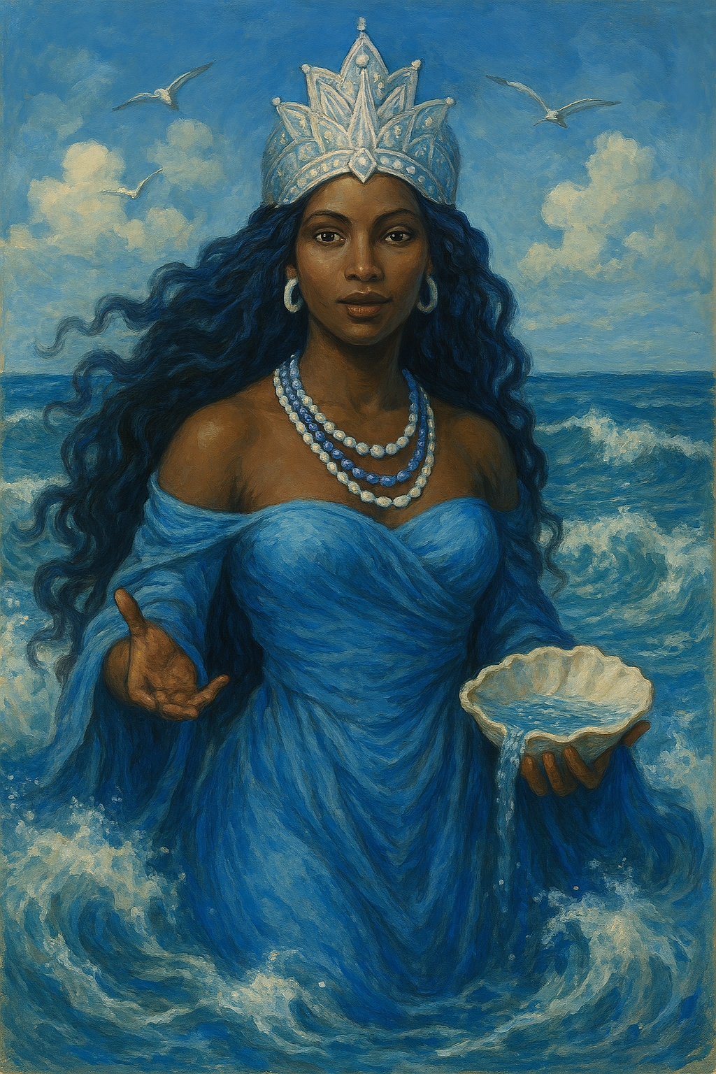 Yemaya came to me during a moonlit bath, when I was steeped in lavender and silence. I’d been holding onto grief like a stone in my chest, and as I whispered my desires into the water, I felt her presence—gentle, vast, maternal.